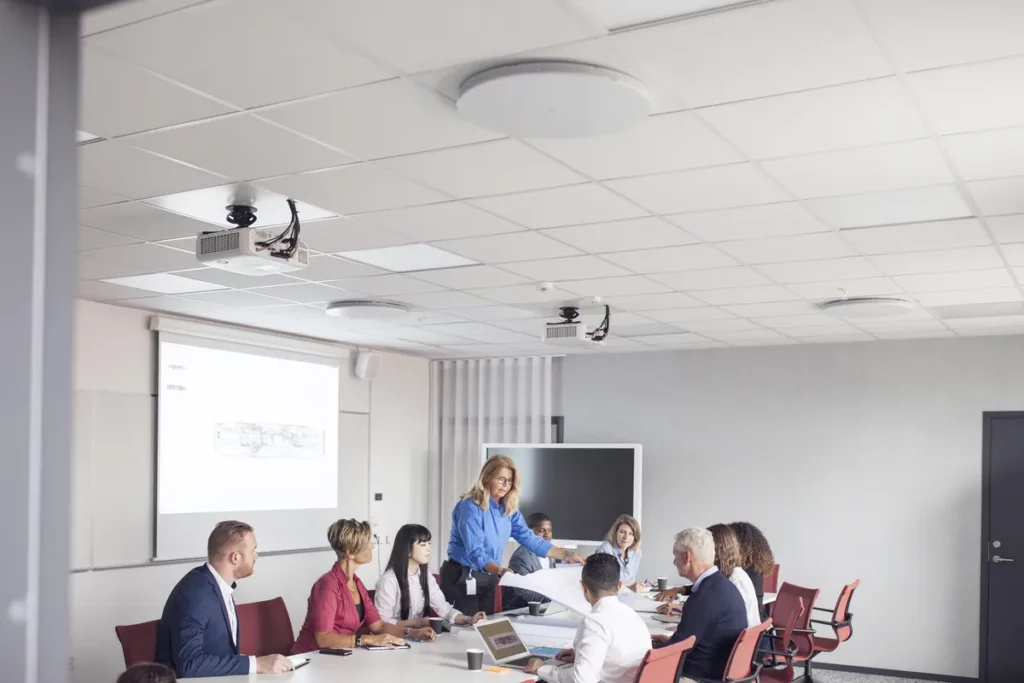 | Salles de réunion / Visio | Échos, difficultés de compréhension, besoin de confidentialité | Panneaux muraux et plafond absorbants, cabines insonorisées | Murs autour de la table, plafond, éventuellement coins (bass traps), cabines d’isolement |